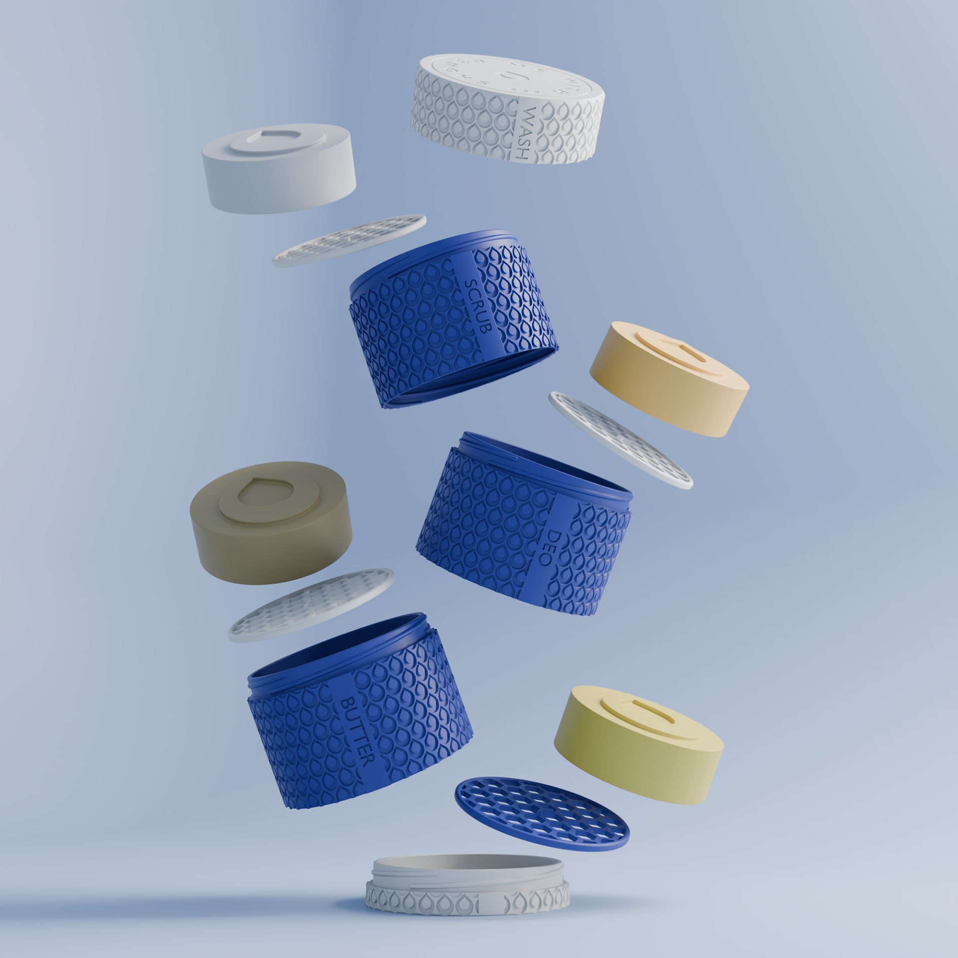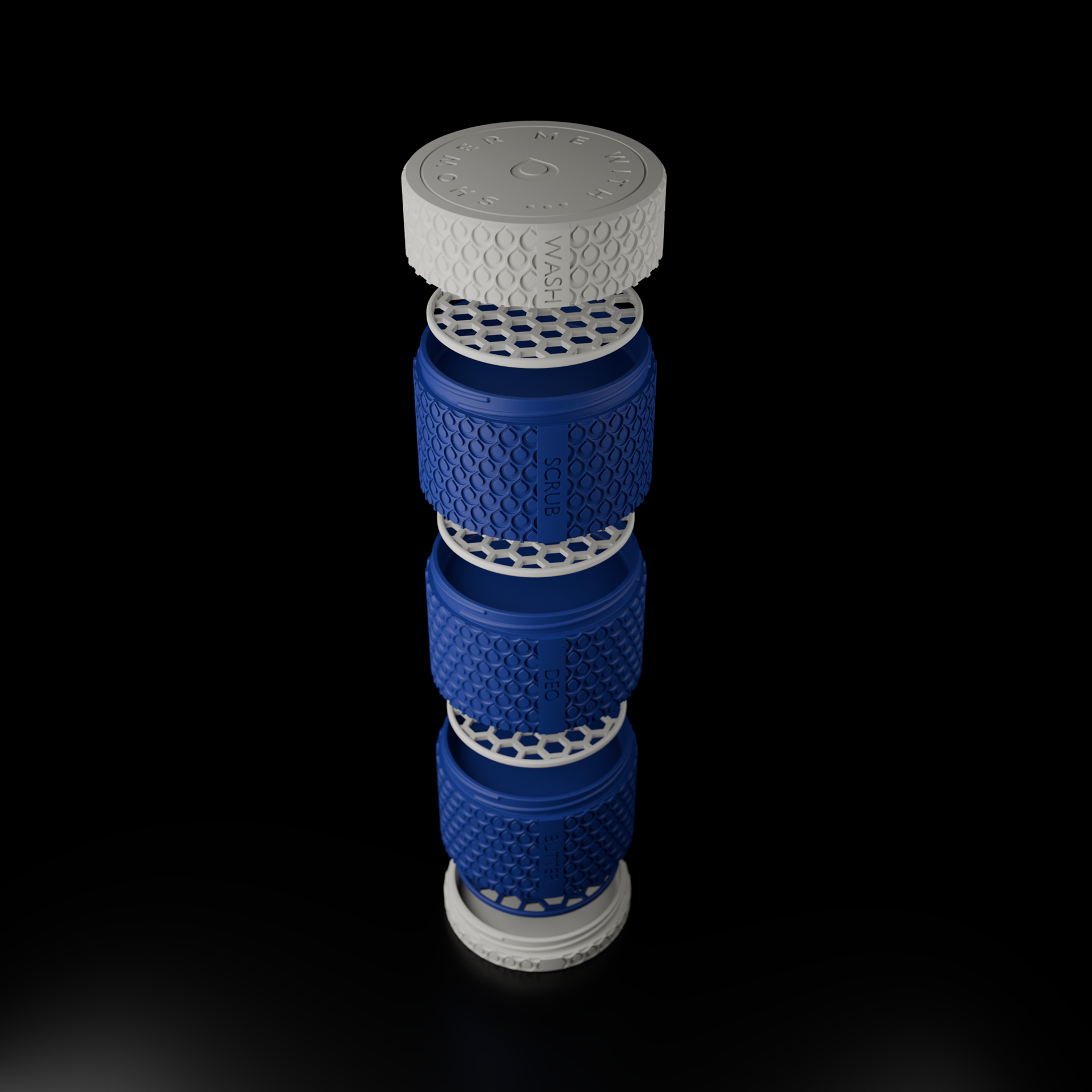 La première, à quatre étages empilables, arbore sur chaque niveau une gravure fine – Wash, Scrub, Deo, Butter – comme un rappel des gestes quotidiens, simples et essentiels.