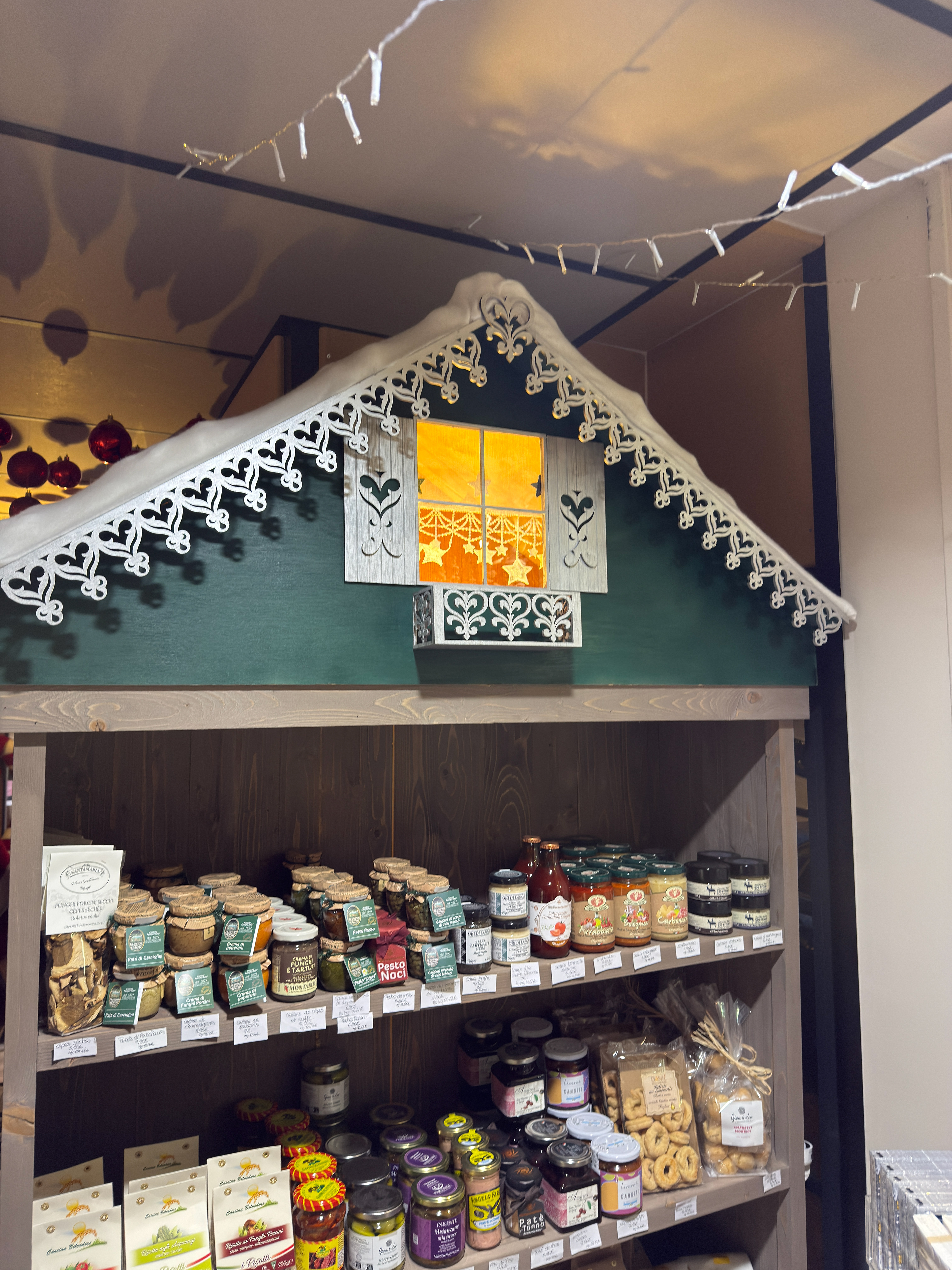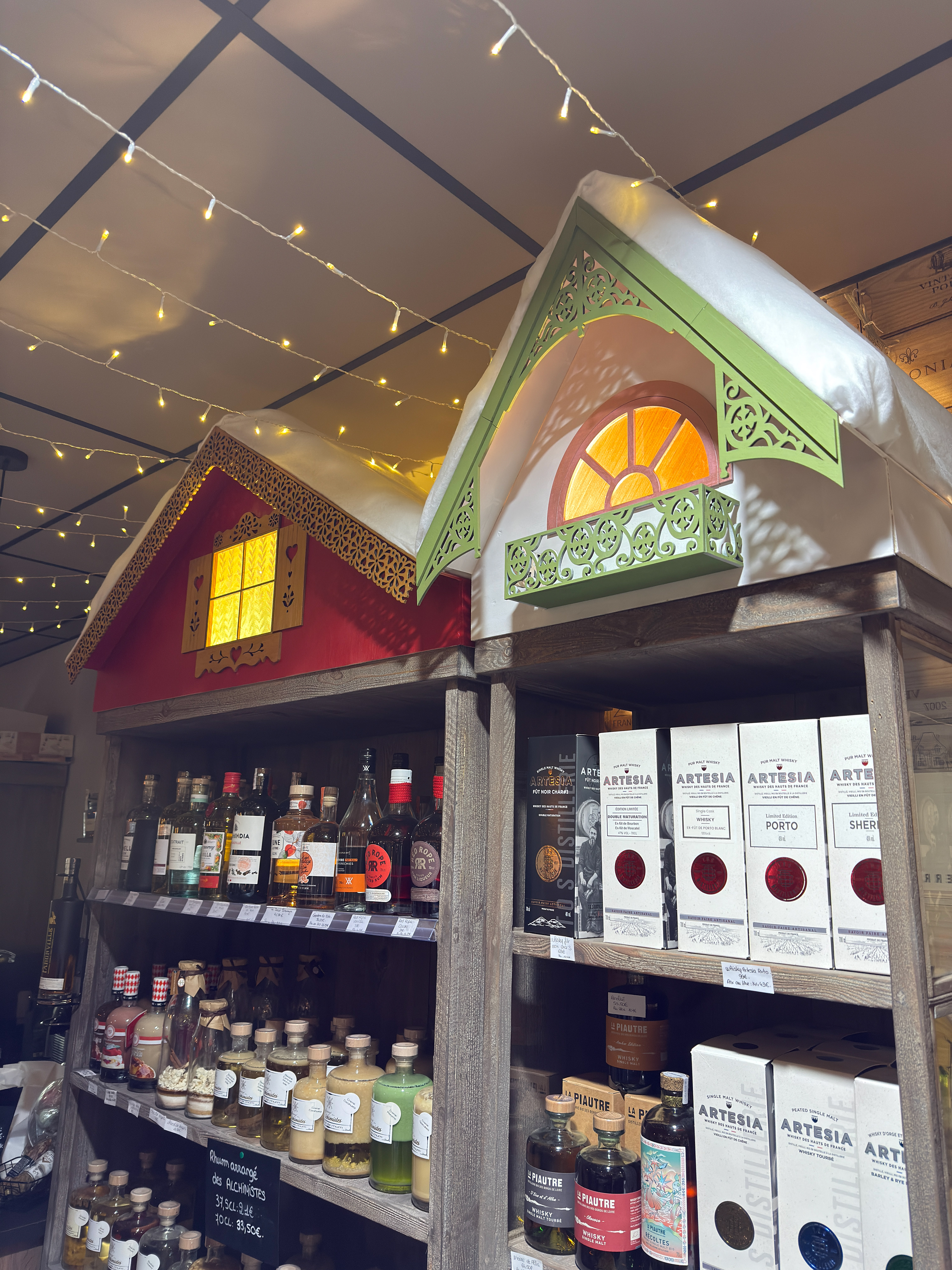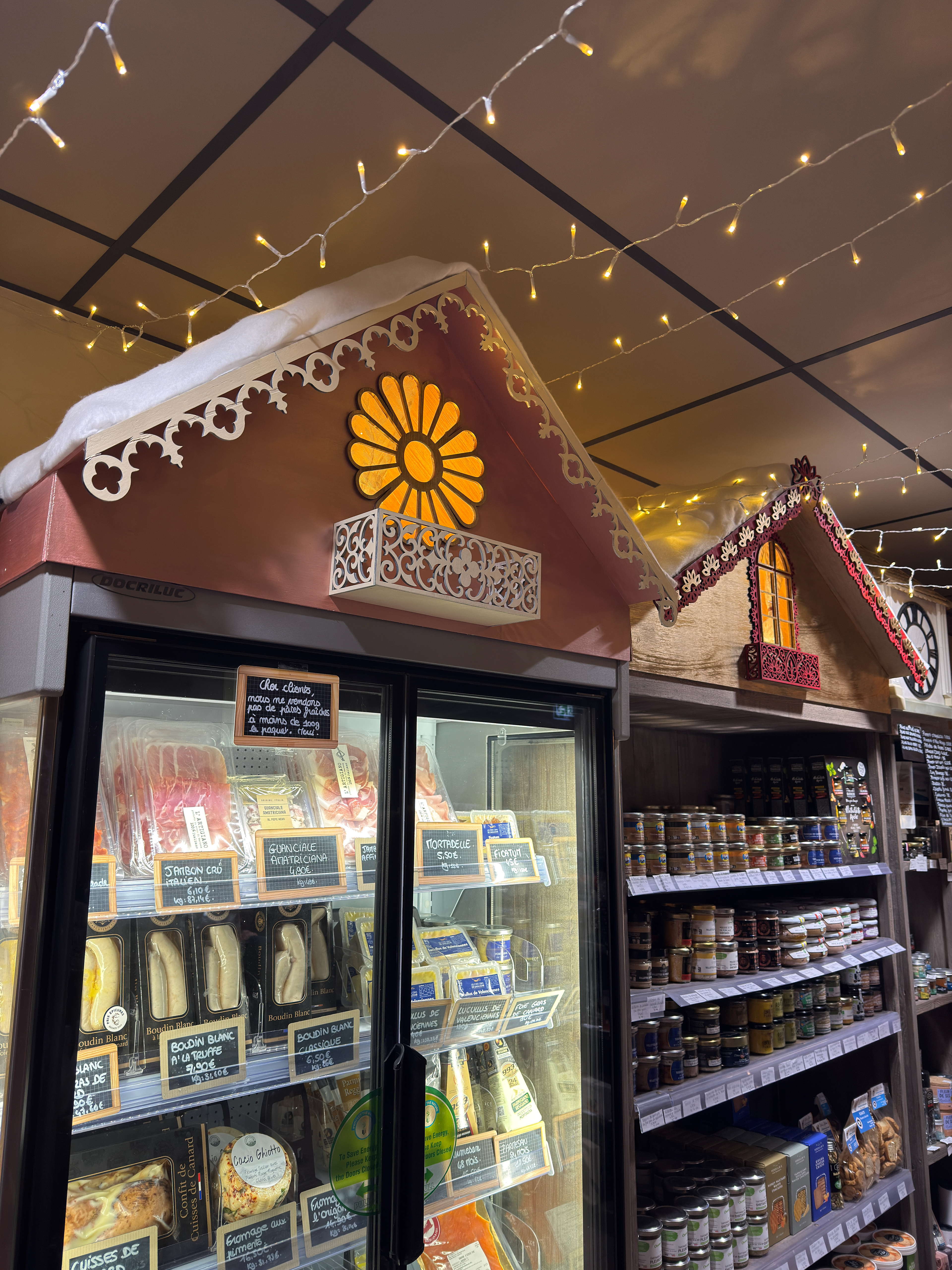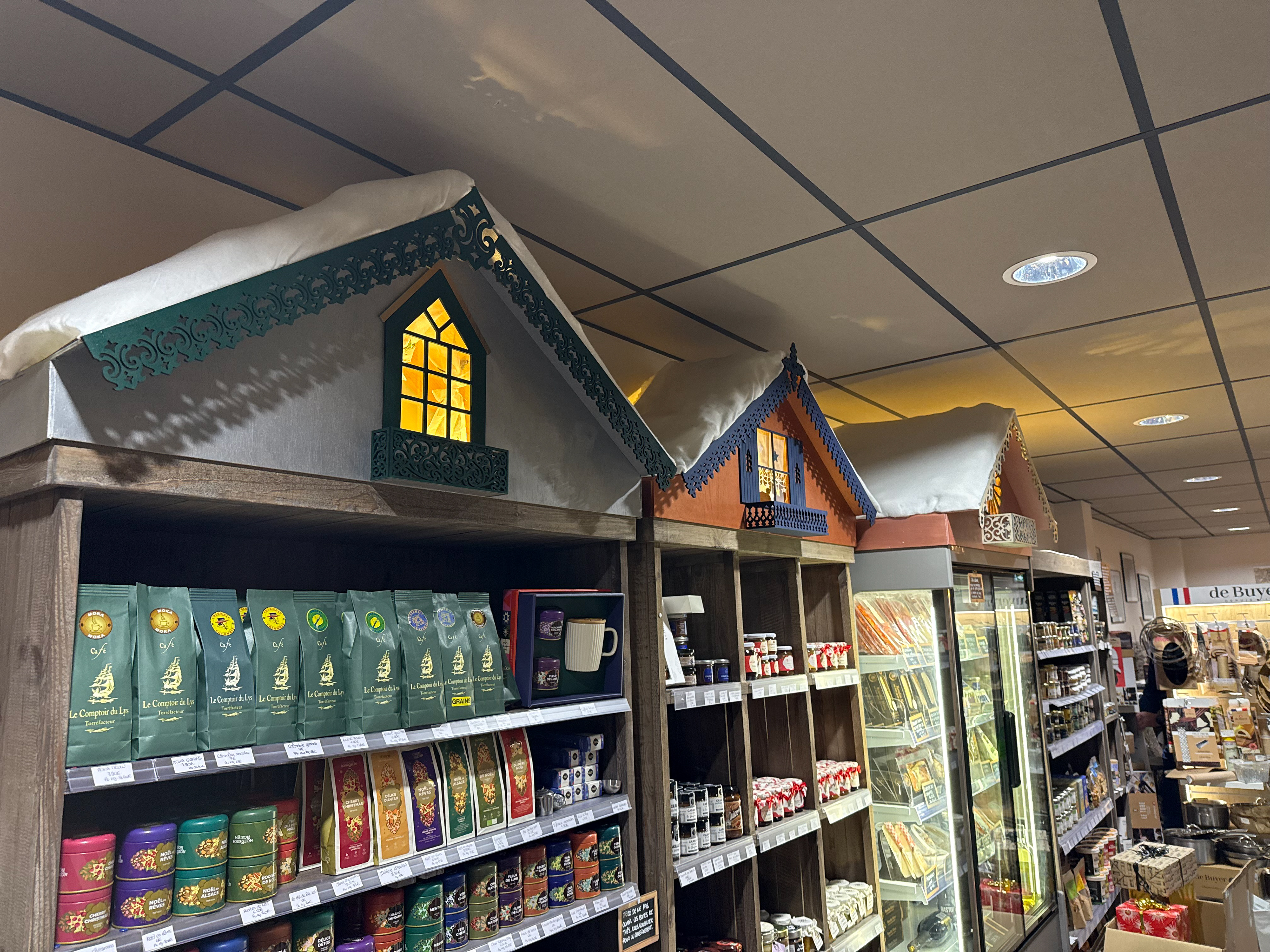 Les étagères sont devenues des chalets, formant un village coloré qui s’intégrait au décor existant de la boutique ❄️