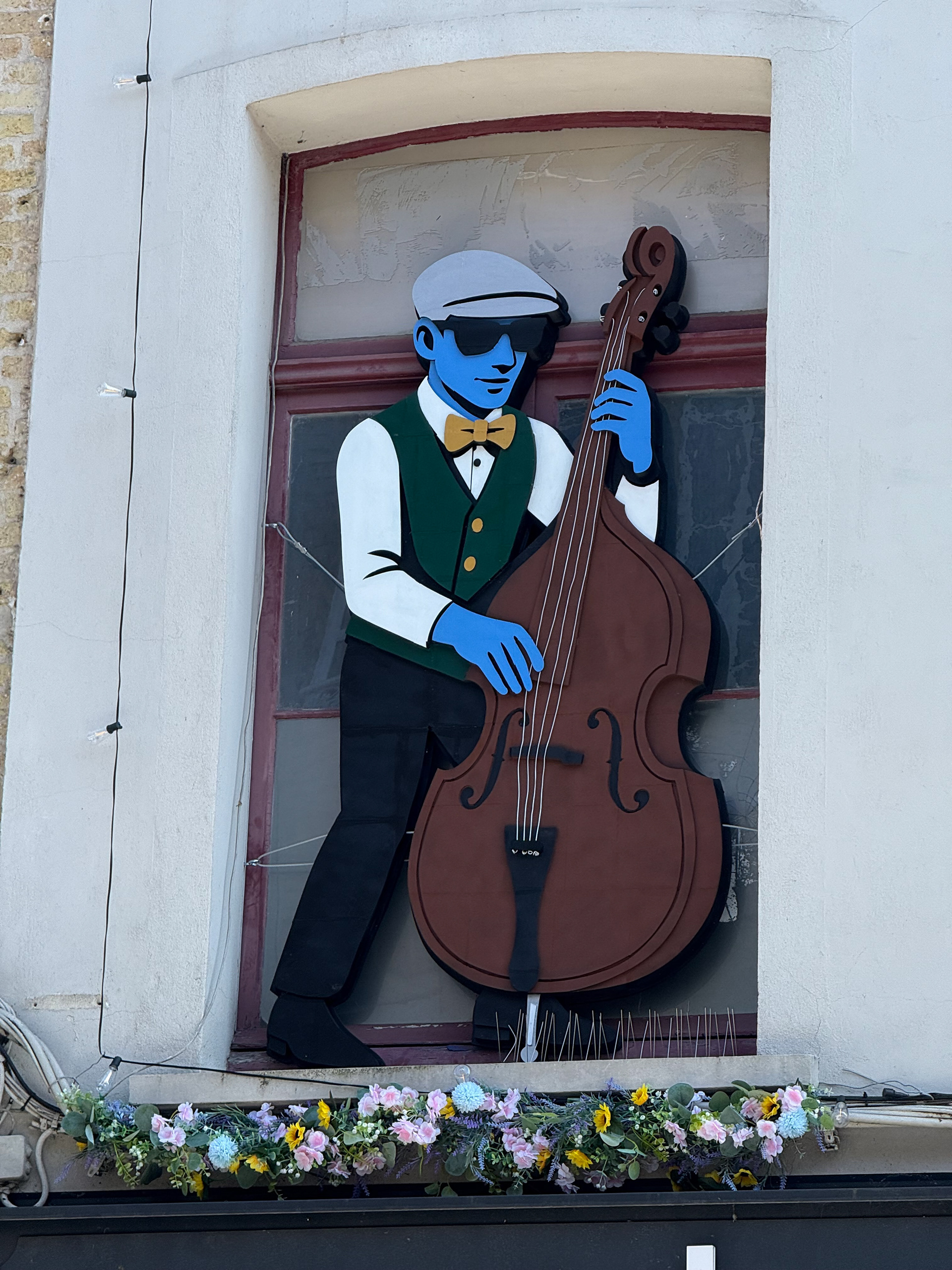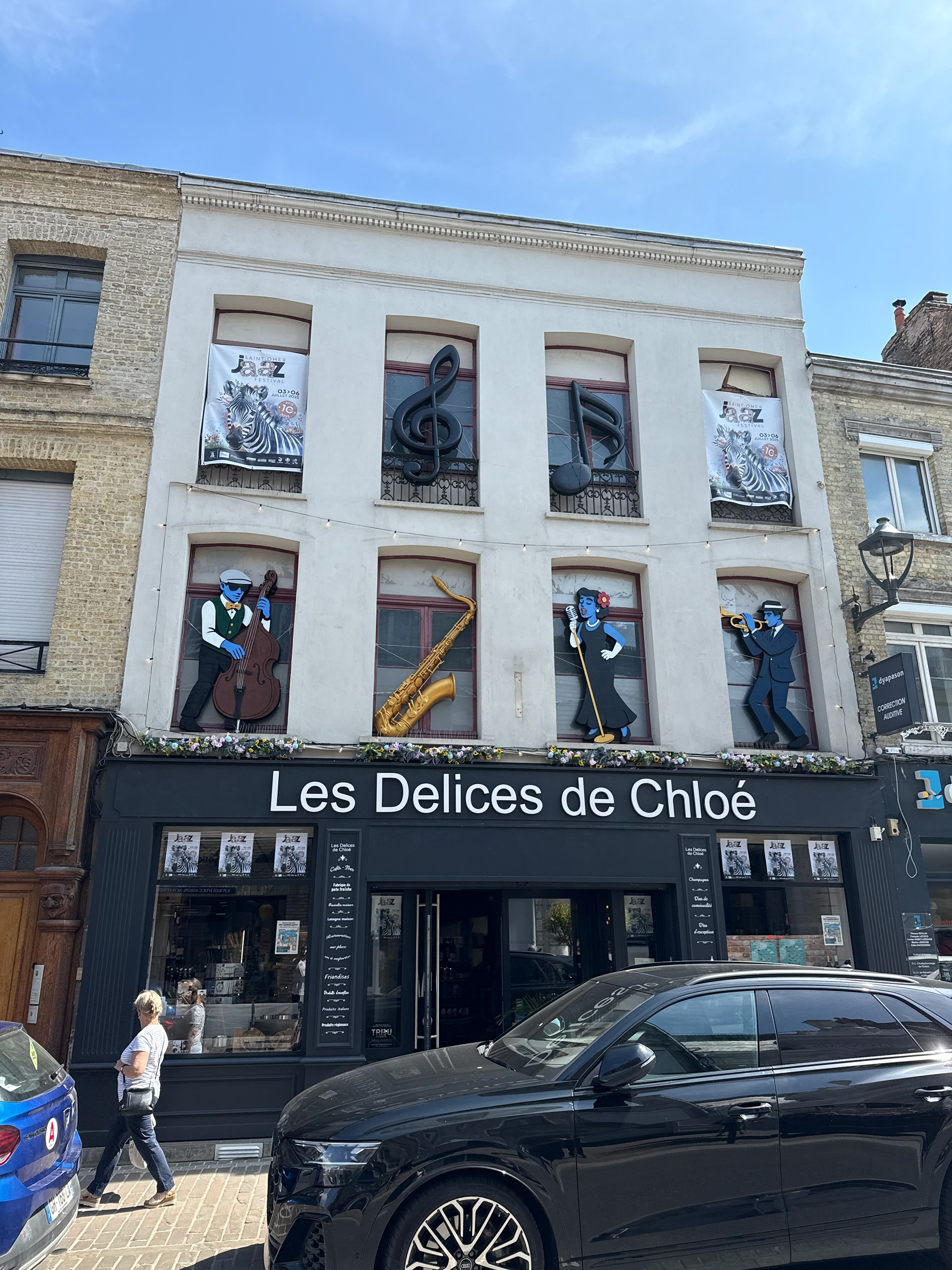 À la demande de François, pour célébrer à la fois le Jazz Festival et la Fête de la Musique, j’ai conçu et réalisé une décoration de façade XXL pour la boutique Les Délices de Chloé.