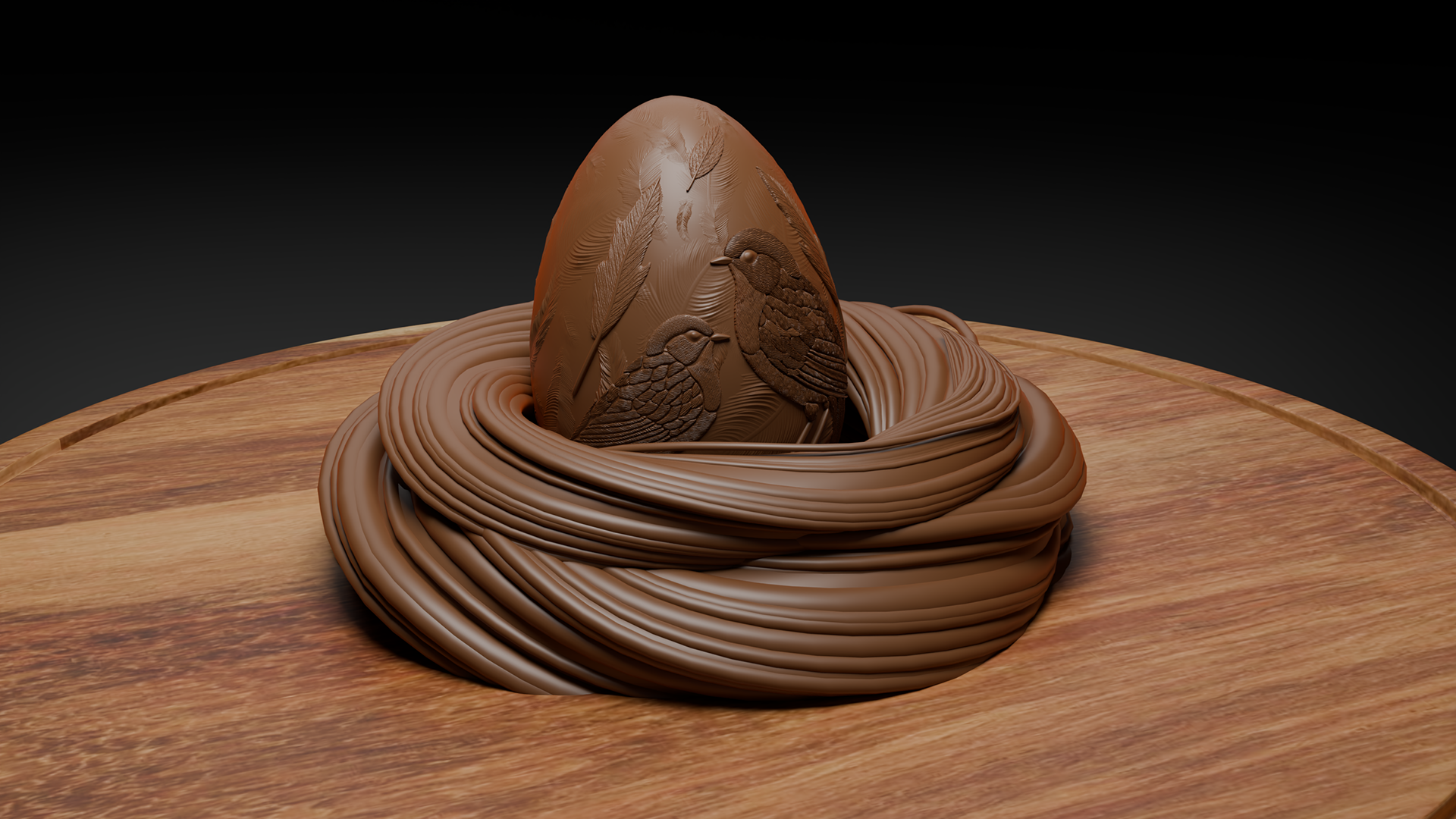 ✏️ Recherche et conception – Élaboration de l’univers visuel et des formes, avec un œuf orné d’oiseaux en relief et un socle en forme de nid.