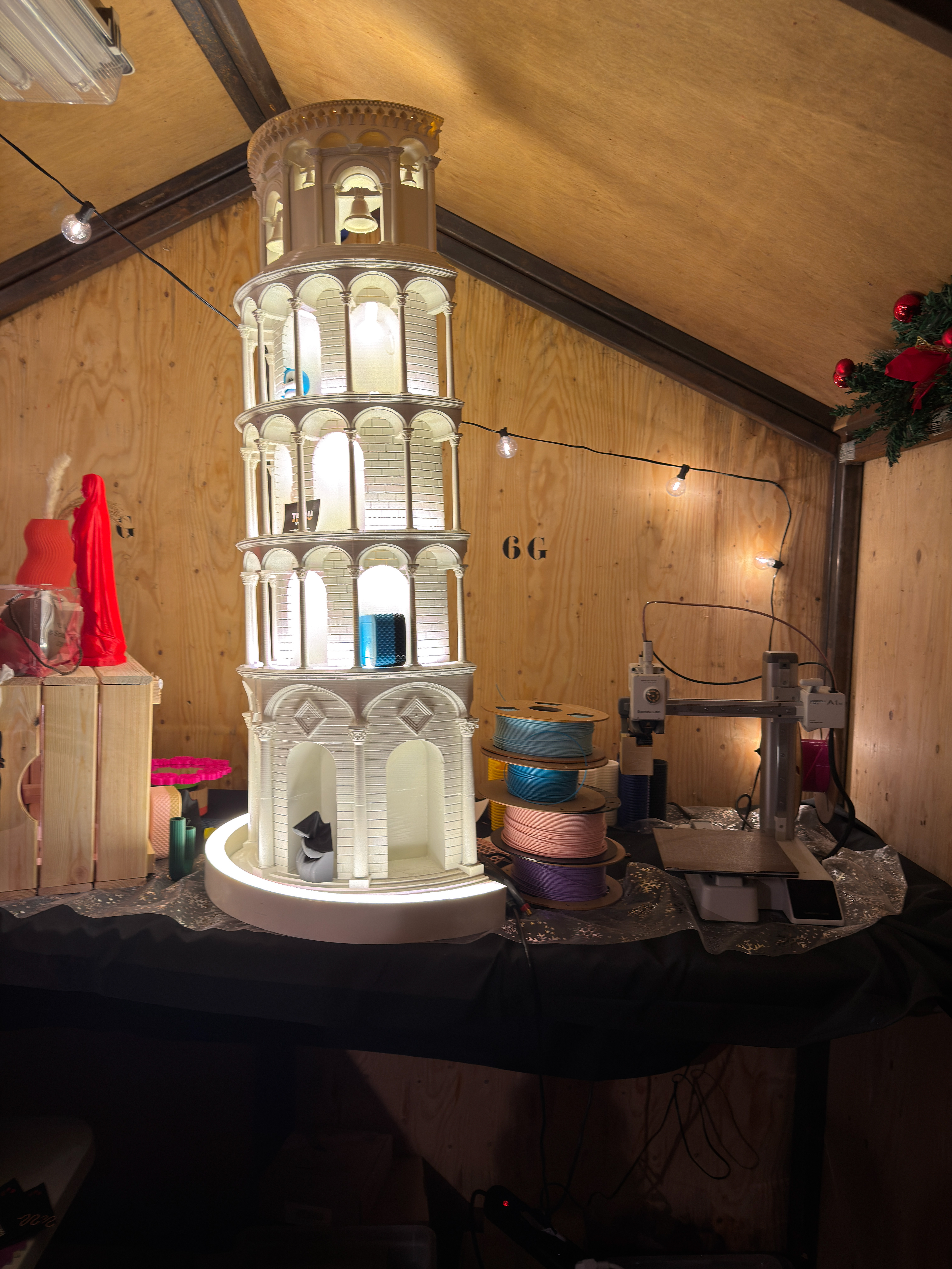 Le cahier des charges : concevoir un présentoir original en forme de Tour de Pise, intégrant un système de lumières LED pour illuminer et sublimer les créations gourmandes exposées.